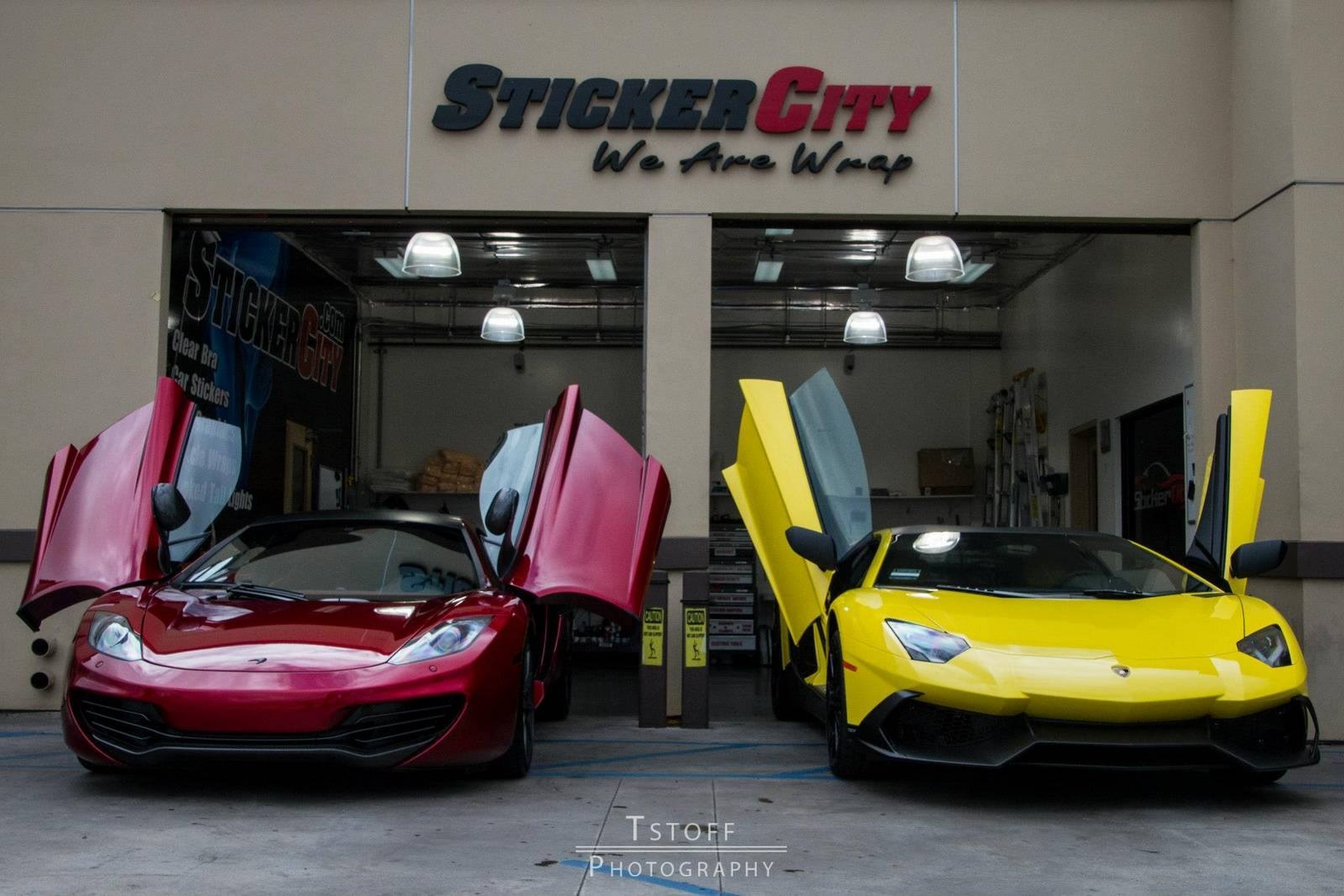 | Hai siêu xe McLaren MP4-12C và Lamborghini Aventador phiên bản mừng sinh nhật khoe kiểu mở cửa tựa như những đôi cánh. Ảnh: GTspirit. |