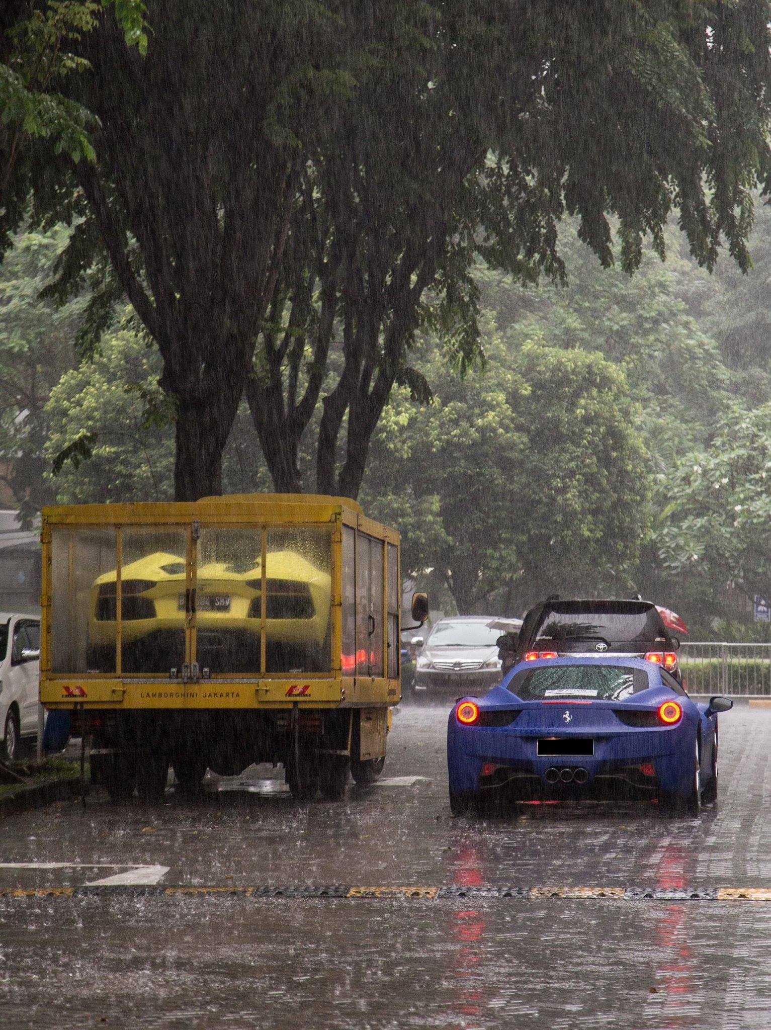 | Ferrari 458 Italia lăn bánh dưới đường, bên cạnh là một siêu xe Lamborghini Aventador được vận chuyển trên xe thùng. Ảnh: BOW Photowork. |