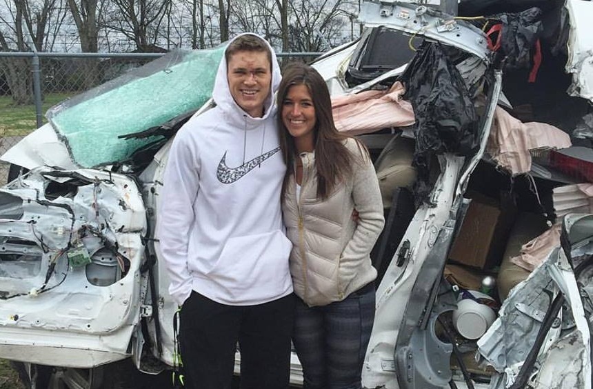 | Chỉ hai ngày sau vụ tai nạn, cặp đôi đã có thể mỉm cười hạnh phúc khi chụp ảnh trước chiếc xe bị dập nát. |