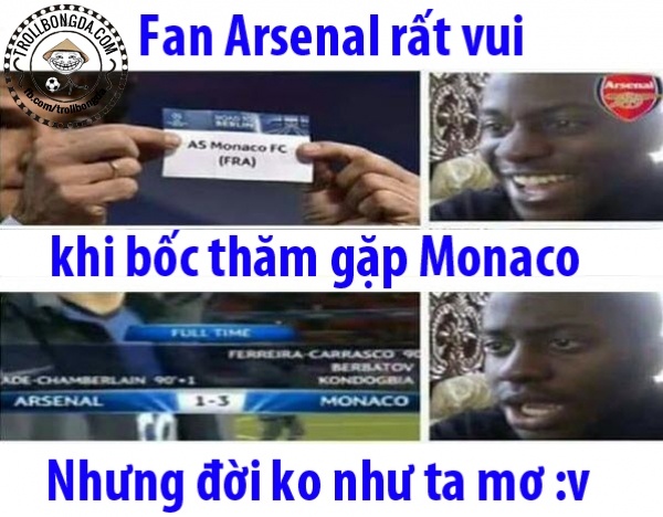 | Fan Arsenal từng rất vui khi lá thăm may rủi đưa đội bóng con cưng của họ gặp AS Monaco, một đối thủ bị đánh giá kém hơn về mọi mặt. Tuy nhiên, kết quả thực tế lại không như mong đợi của người hâm mộ Pháo thủ. |