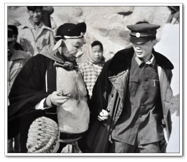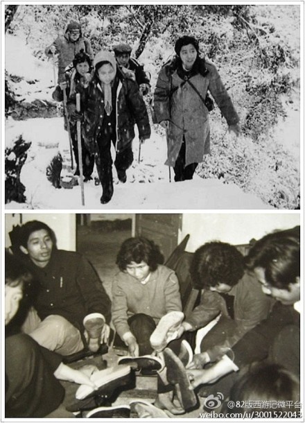 Khi đoàn đến núi Hoàng Sơn (An Huy), đói và lạnh, ghé vào nhà dân phơi giày và nướng bánh ăn (trong ảnh Dương Khiết, quay phim Vương Sùng Thu và biên kịch Trâu Ức Thanh).