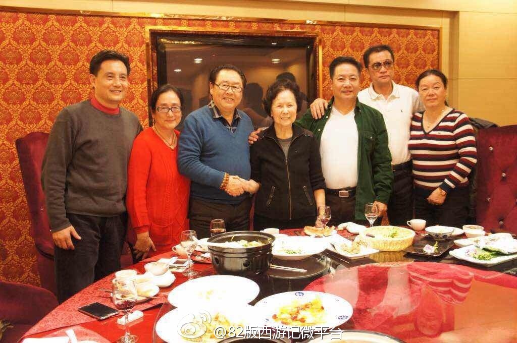 Từ phải qua là vợ chồng Lâm Chí Khiêm (Nhị lang thần), Uông Việt, Dương Khiết, Mã Đức Hoa với vợ (Hầu Ngọc Mẫn, áo đỏ) và Vương Bá Chiêu (Tiểu Bạch long) trong một bữa tiệc, đầu 2015.