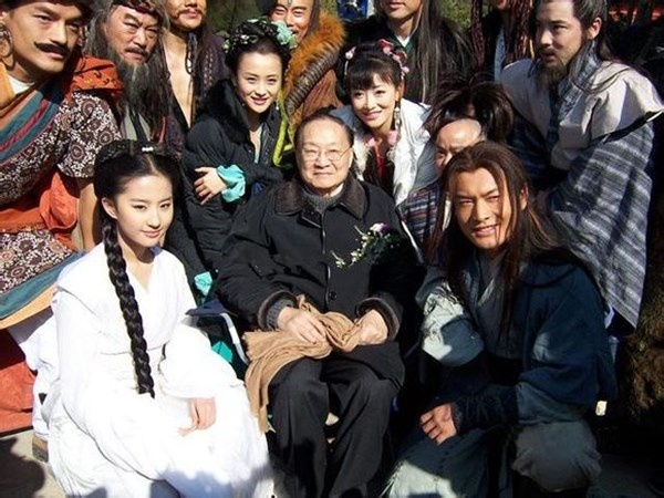 | Kim Dung chụp ảnh cùng đoàn phim Thần điêu đại hiệp. |