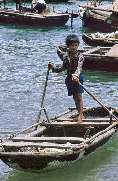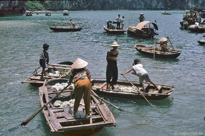 | Cuộc sống của những người dân chài trên mặt vịnh những năm 90, mỗi con thuyền là một gia đình nhỏ, gồm vợ chồng và 2-3 đứa con. |