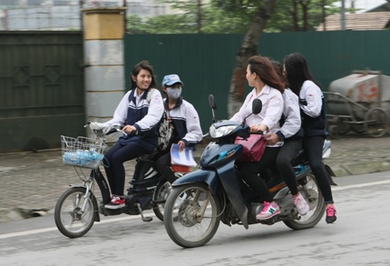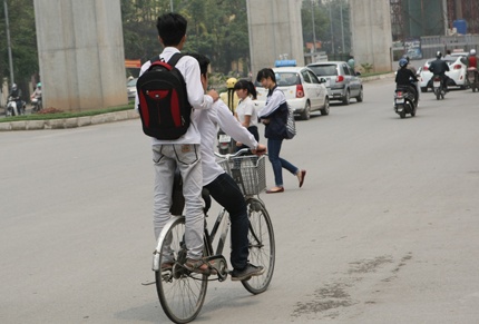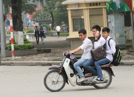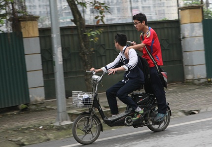 | Ba nam sinh vô tư đi xe với đầu trần, kẹp ba. |