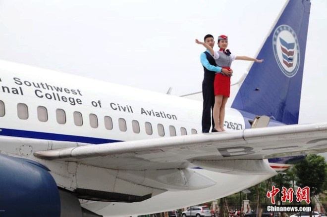 | Theo Shanghaiist, những sinh viên Đại học Hàng không Dân dụng tỉnh Tứ Xuyên, Trung Quốc mới đây khiến cộng đồng mạng chú ý với bộ ảnh tốt nghiệp đầy sáng tạo. |