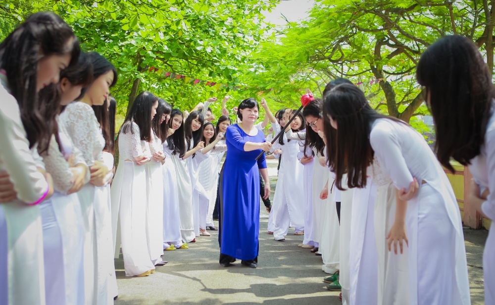 | Cô chủ nhiệm nhiệt tình tham gia chụp ảnh với cả lớp. Kết thúc 3 năm học, tập thể lớp 12 chuyên Anh đã trở thành một đại gia đình. |