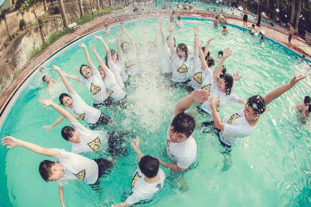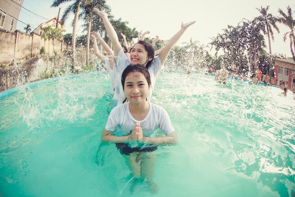 | Các bạn trẻ không ngừng vui đùa bên làn nước xanh mát. |