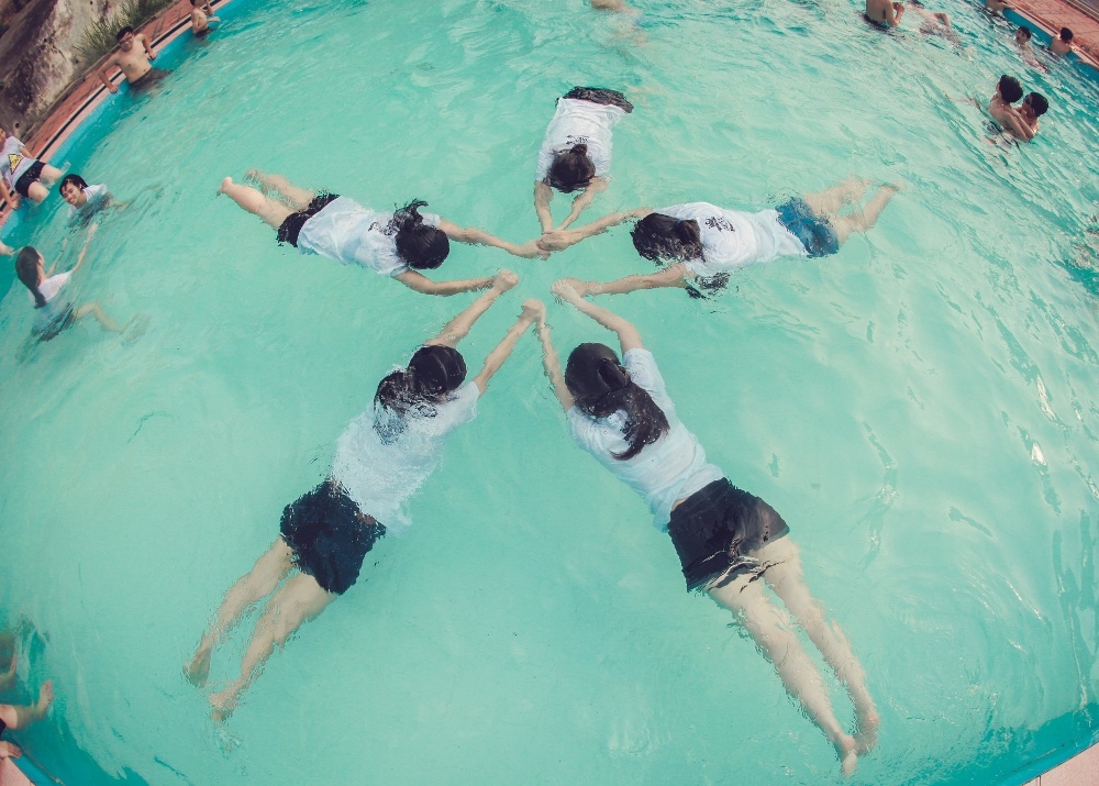 | Những cô gái đam mê ngoại ngữ thích thú tạo dáng trong bể bơi. |
