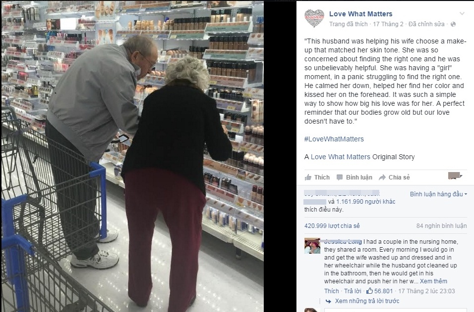 Theo Wsfm, bức ảnh một cặp vợ chồng cao tuổi vào siêu thị chọn mua mỹ phẩm hiện trở thành tâm điểm trong cộng đồng mạng thế giới. Khoảnh khắc này thu hút hơn 1 triệu like (thích) và gần 500.000 chia sẻ trên fanpage 2,5 triệu người theo dõi - Love What Matters.