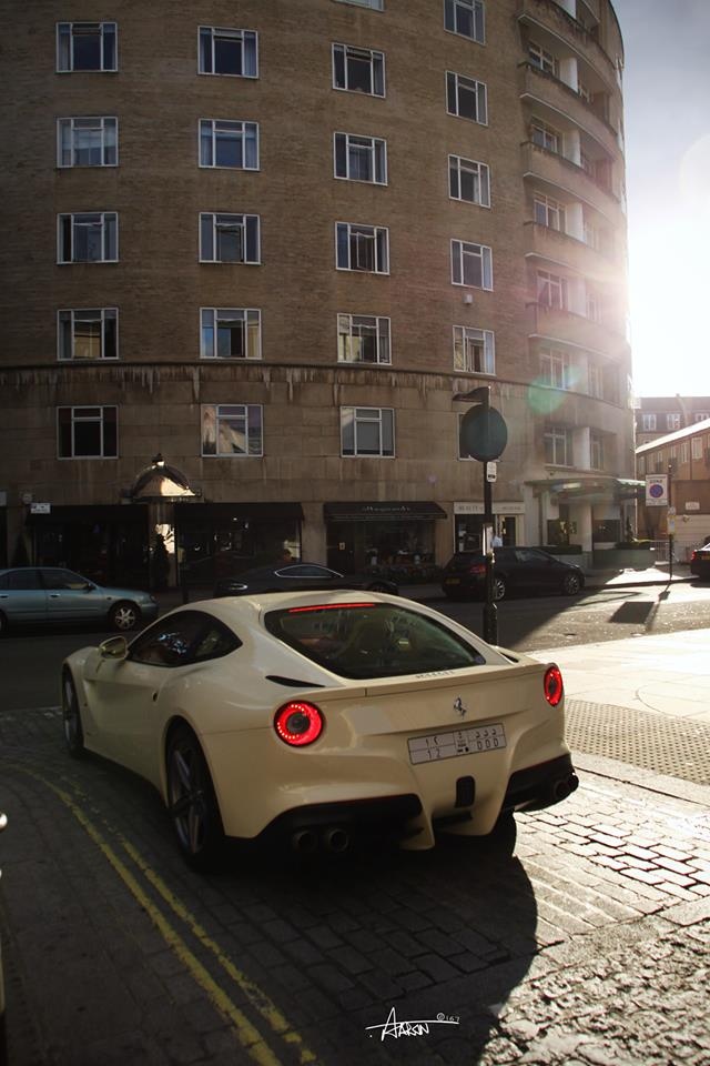 | Ferrari F12 Berlinetta màu trắng sữa đón mặt trời lăn ở London. |