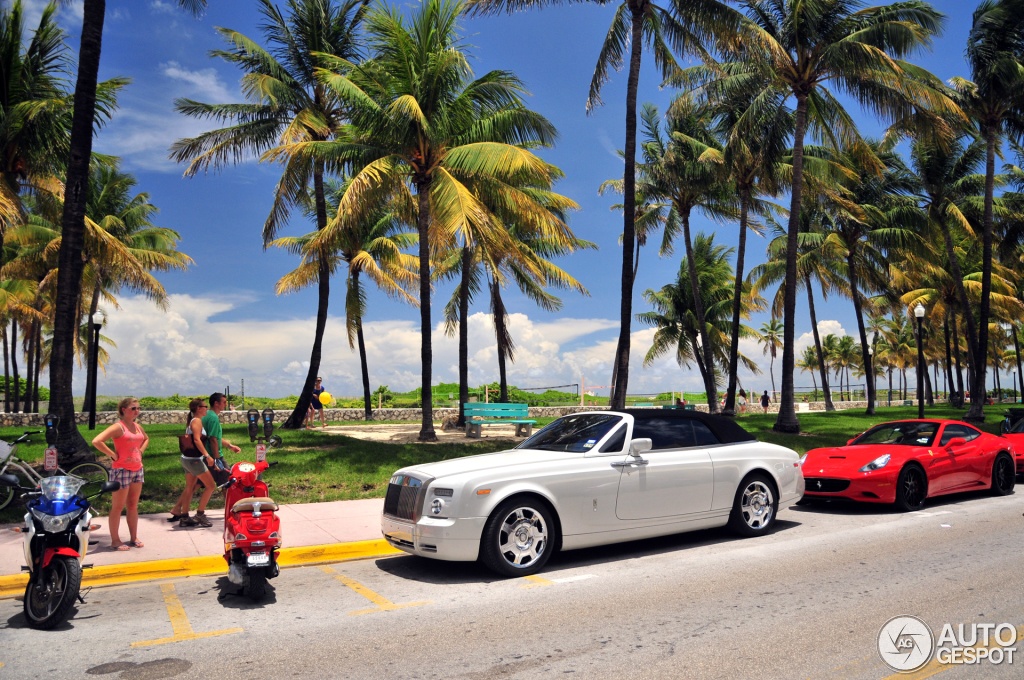| Rolls-Royce Phantom Drophead Coupe và Ferrari California khoe vẻ đẹp ở bãi biển Miami (Mỹ). |
