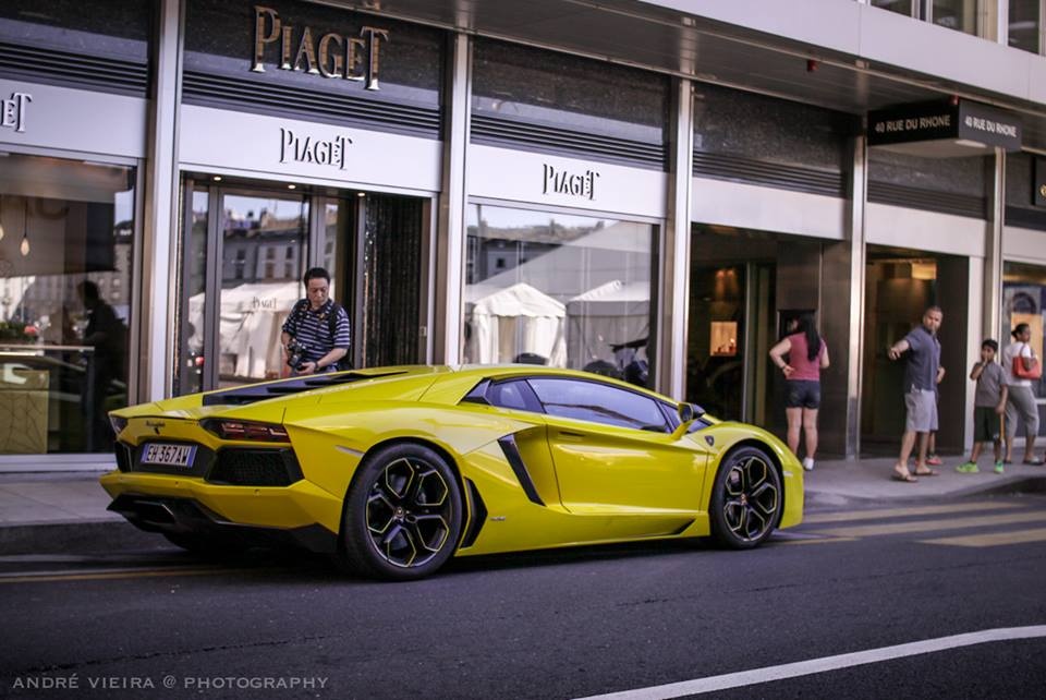 | Siêu xe Lamborghini Aventador LP700-4 màu vàng ở Geneve, Thụy Sỹ. |