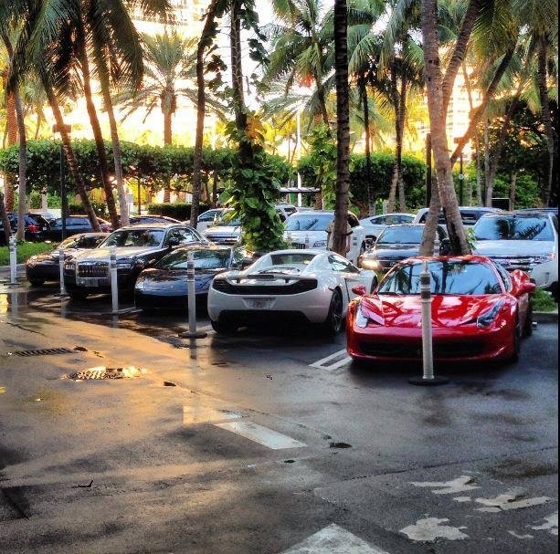 Bãi đỗ toàn siêu xe ở Miami, Mỹ, với sự góp mặt của Ferrari 458 Spider , McLaren MP4-12C Spider, Gallardo, Rolls-Royce Ghost, Aston Martin V8 Vantage.