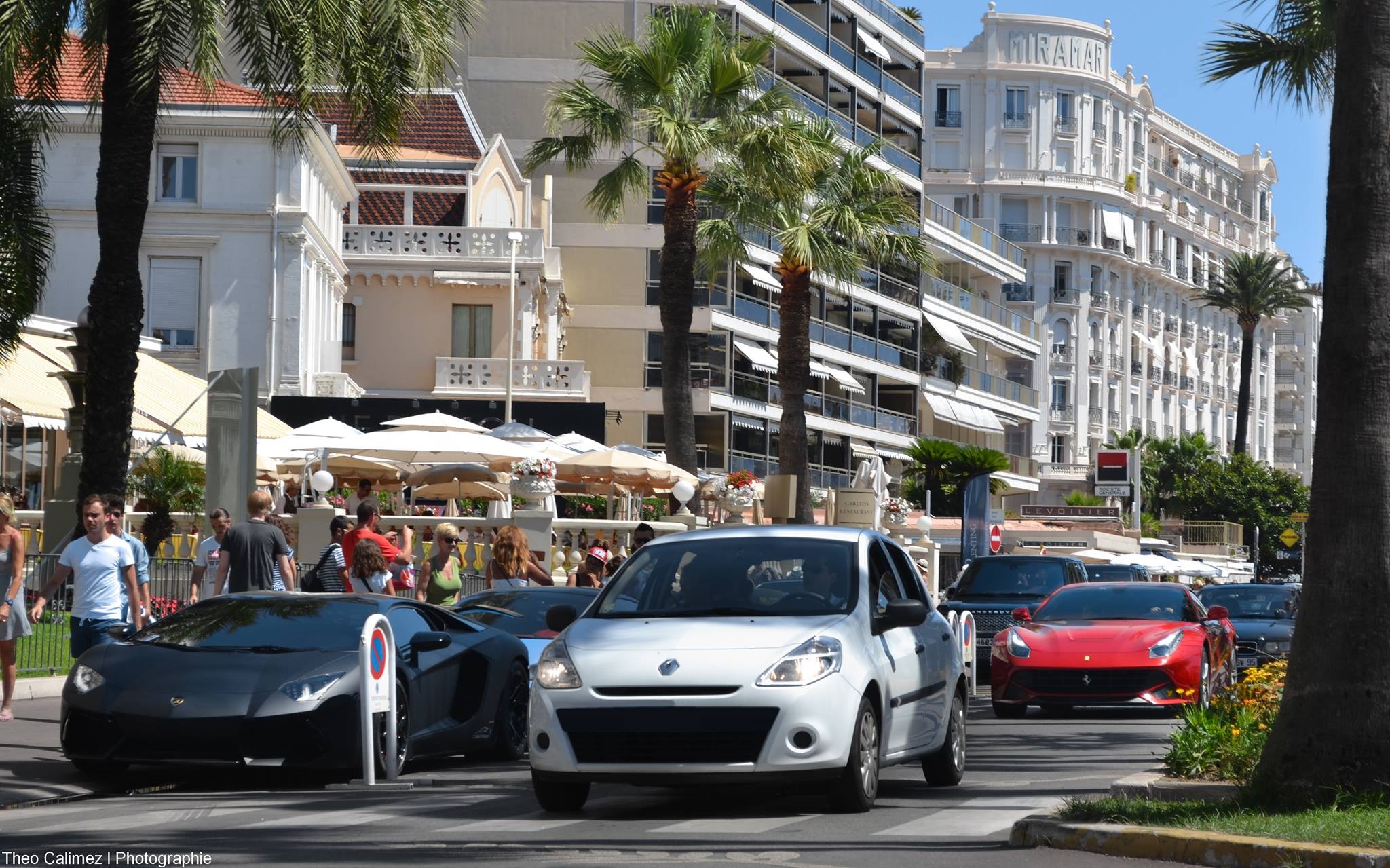 | Một chiếc Renault Clio kẹp giữa "siêu bò" Aventador LP700-4 đen nhám hầm hố và "ngựa chồm" Ferrari F12 Berlinetta. Cả hai siêu xe đến từ Ý đều sở hữu sức mạnh 700 mã lực và được coi là đối thủ trực tiếp của nhau. |
