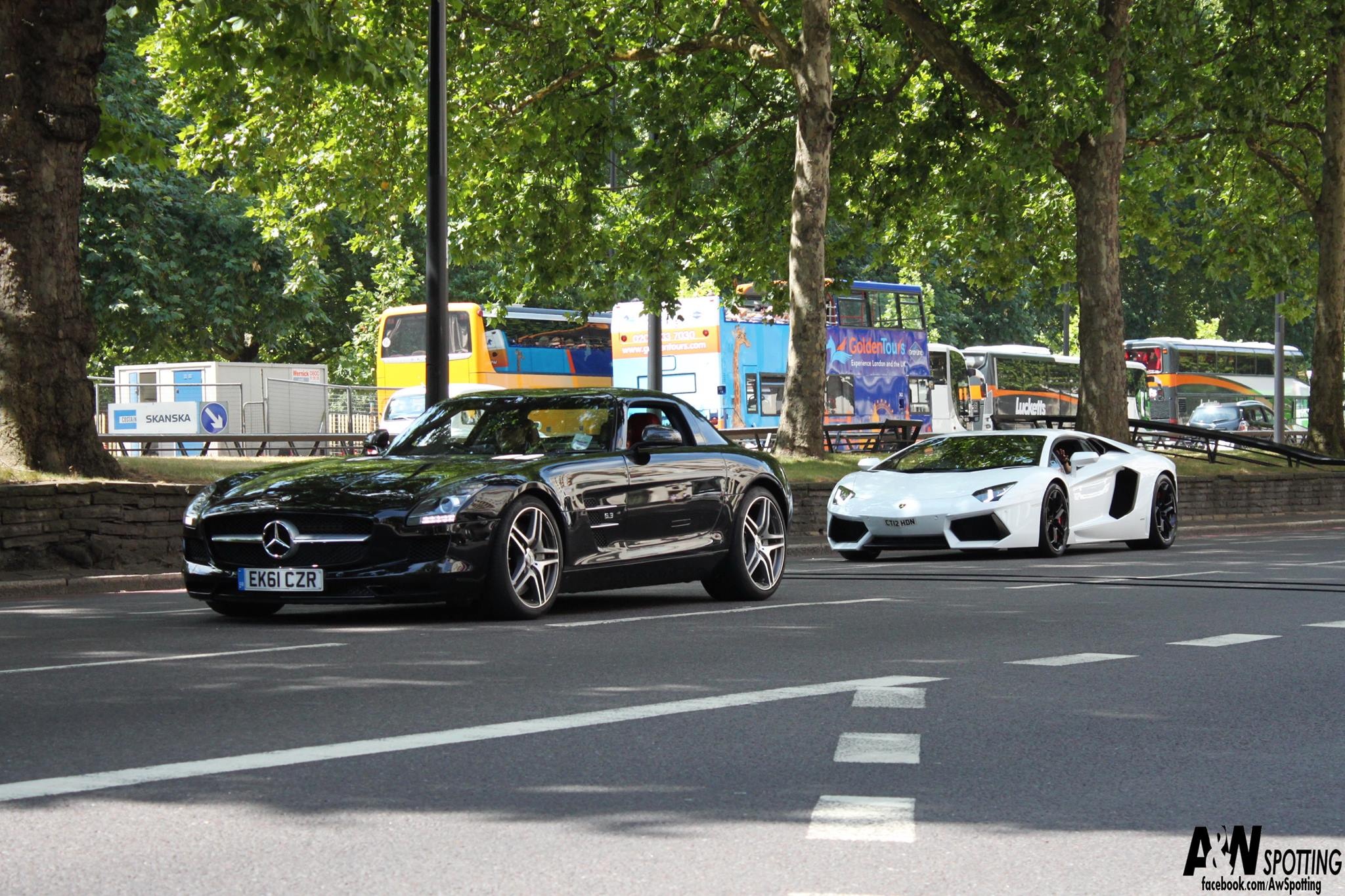 Cặp siêu xe Lamborghini Aventador và Mercedes-Benz SLS AMG song hành trên phố. SIêu xe của Đức trang bị động cơ V8 6,2 lít, DOHC , công suất 571 mã lực tại 6.800 vòng/phút và mô-men xoắn cực đại 650 Nm tại 4.750 vòng/phút, có thể tăng tốc từ 0-100 km/h trong 3,2 giây và đạt vận tốc tối đa 328 km/h.