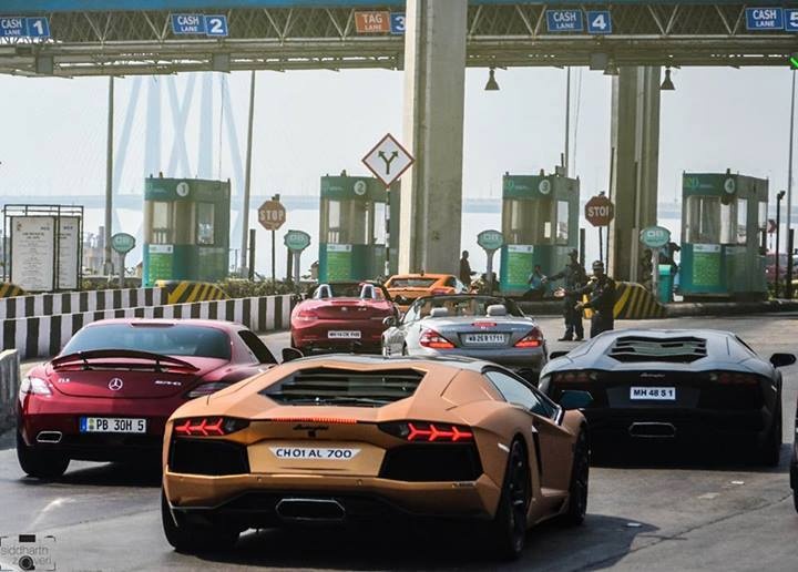 | Một loạt siêu xe được phân làn tại một trạm thu phí. |