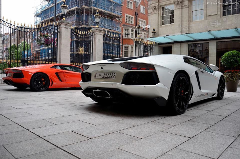| Bộ đôi Lamborghini Aventador LP700-4 màu cam và trắng ở London. |