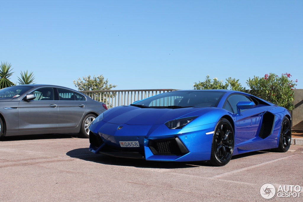 | Lamborghini Aventador LP700-4 màu xanh dương ở Monaco, Pháp. |