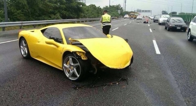 | Siêu xe Ferrari 458 Italia màu vàng của ông chủ iPE Exhausts - công ty sản xuất ống xả cho siêu xe hàng đầu thế giới gặp nạn ở Đài Loan. |