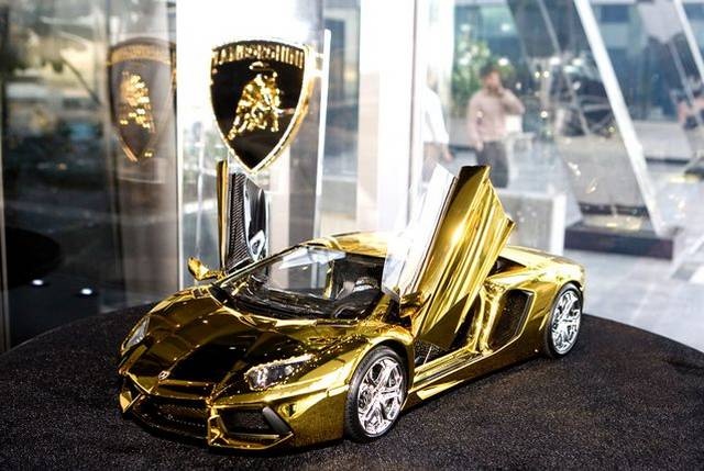 | Mô hình siêu xe Lamborghini Aventador với mỗi ghế ngồi đính 700 viên kim cương, thân xe được phủ 25 kg vàng nguyên chất. Ngoài ra, còn có kim cương ở đuôi xe và đèn pha. Giá bán của mô hình siêu xe này lên đến 7,3 triệu USD. |