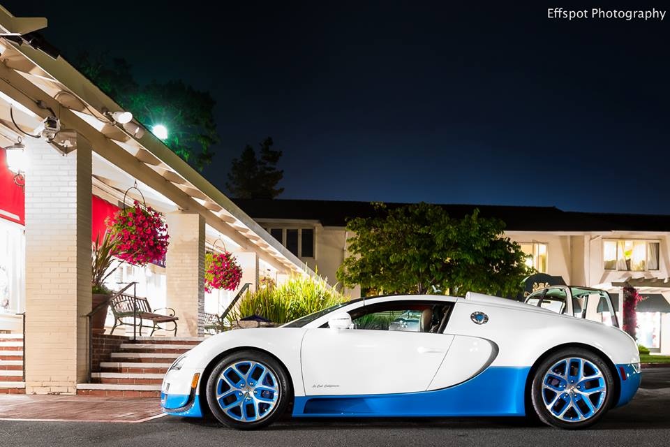 | Bugatti Veyron Vitesse Le Ciel California. Phiên bản đặc biệt này ra mắt năm 2012, nổi bật với hai tông màu trắng, xanh ở ngoại thất và nội thất với da Cognac màu nâu. Giá bán của model này là 2,5 triệu USD. |