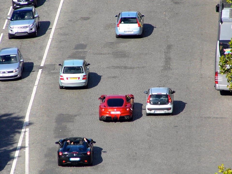 | Ferrari F12 màu đỏ và F458 Spyder màu đen trên đường phố Paris. |