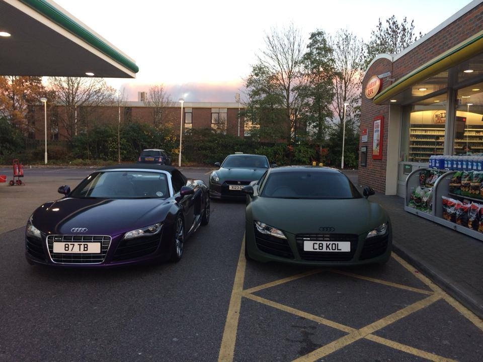 | Cặp đôi siêu xe Audi R8 mui trần và phiên bản coupe màu độc, đỗ phía trước siêu xe Nissan GT-R. |