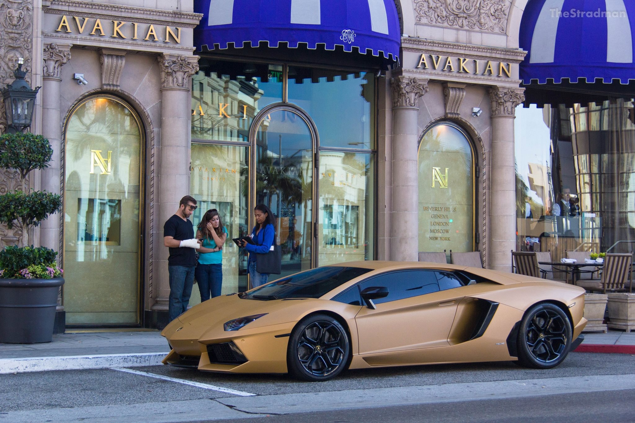 | Siêu xe Aventador trong bộ cánh lạ lẫm trên đường phố Beverly Hills, California, Mỹ. Đây có lẽ là siêu xe sở hữu nhiều màu sắc nhất trên thế giới. |