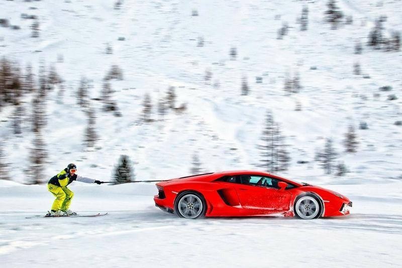 | Siêu xe Lamborghini Aventador trổ tài chạy trên đường tuyết. Siêu xe 700 mã lực của Lamborghini được sử dụng như một công cụ hỗ trợ cho vận động viên trượt tuyết. |