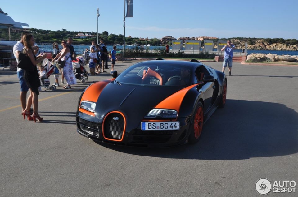 | Một chiếc Bugatti Veyron 16.4 Grand Sport Vitesse World Record Car Edition xuất hiện ở Porto Cervo, Italy. Tên xe để chỉ mẫu siêu xe mui trần chạy nhanh nhất thế giới, 408 km/h. Bugatti chỉ sản xuất đúng 8 chiếc "World Record Car" với giá bán khoảng 2,6 triệu USD mỗi chiếc. |