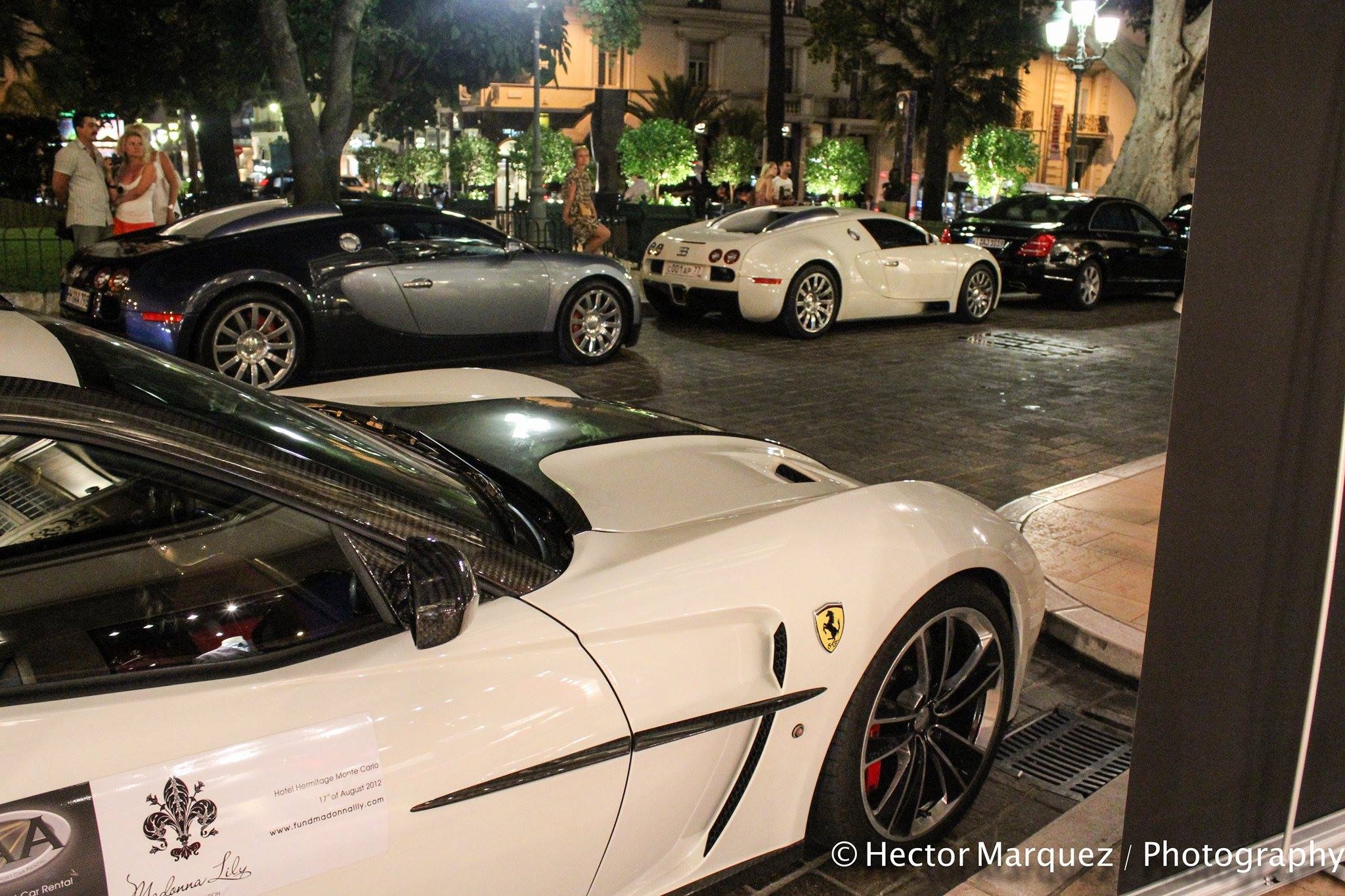 | Có đến 2 siêu xe Bugatti Veyron đậu tại một bãi xe, cùng với đó là một chiếc xe độ mang lô gô Ferrari và một chiếc sedan sang trọng của Lexus. |