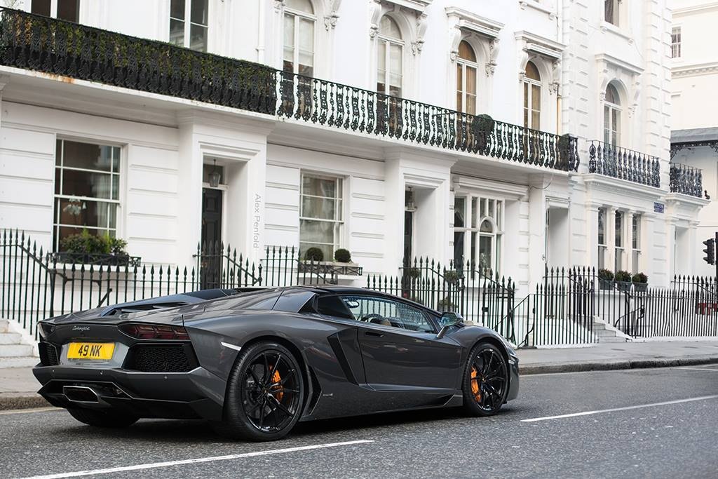 | Siêu xe mui trần Lamborghini Aventador Roadster đen bóng xuất hiện trên phố. |