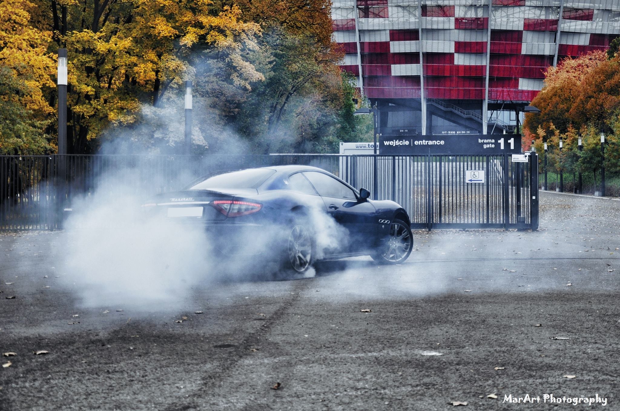 | Màn đốt lốp mịt mù khói của mẫu xe thể thao hai cửa Maserati GranTurismo Sport. |