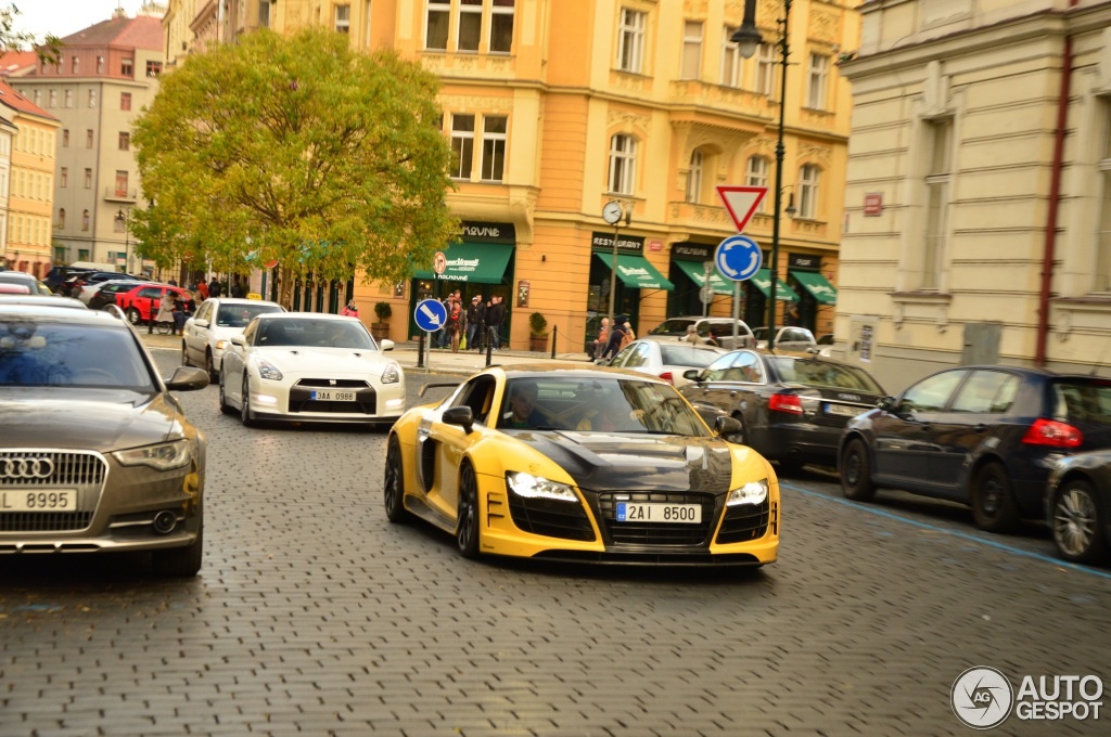 | Siêu xe Audi R8 V10 độ trên đường phố Séc, theo sau là siêu xe Nissan GT-R. |