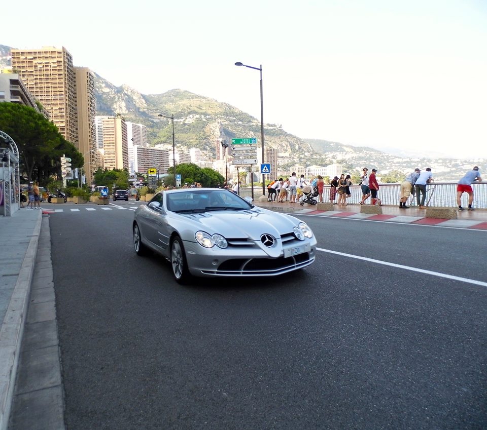 Siêu xe Mercedes-Benz SLR McLaren được trang bị khối động cơ V8 5,4 lít chế tạo thủ công của AMG cho công suất 626 mã lực tại 6.500 vòng/phút và mô-men xoắn cực đại 780 Nm, đi kèm với một số tự động 5 cấp, truyền động cầu sau, giúp xe có thể tăng tốc từ 0-100 km/h trong 3,8 giây và có thể đạt tốc độ tối đa. Hình ảnh này được ghi lại tại "thiên đường siêu xe" Monaco, Pháp