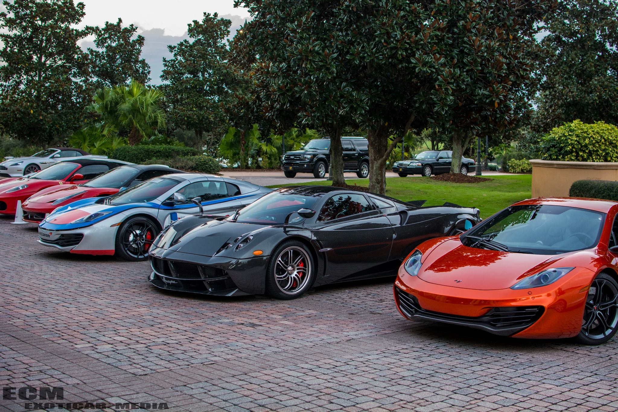 | Siêu xe Pagani Huayra nằm giữa hai siêu xe McLaren MP4-12C. Bên cạnh đó là một số siêu xe khác của Ferrari. Ảnh: Exoticar Media |