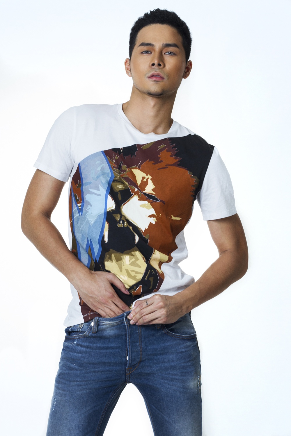 Để nổi bật phong cách chàng trai mùa hè, Dương Mạc Anh Quân chọn T-shirt in họa tiết khổ lớn hoặc áo sơ-mi cổ điển.