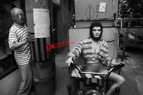 | Hình ảnh người mẫu được đặt đối lập với khung cảnh là cuộc sống thường ngày của người dân trên đường phố. |