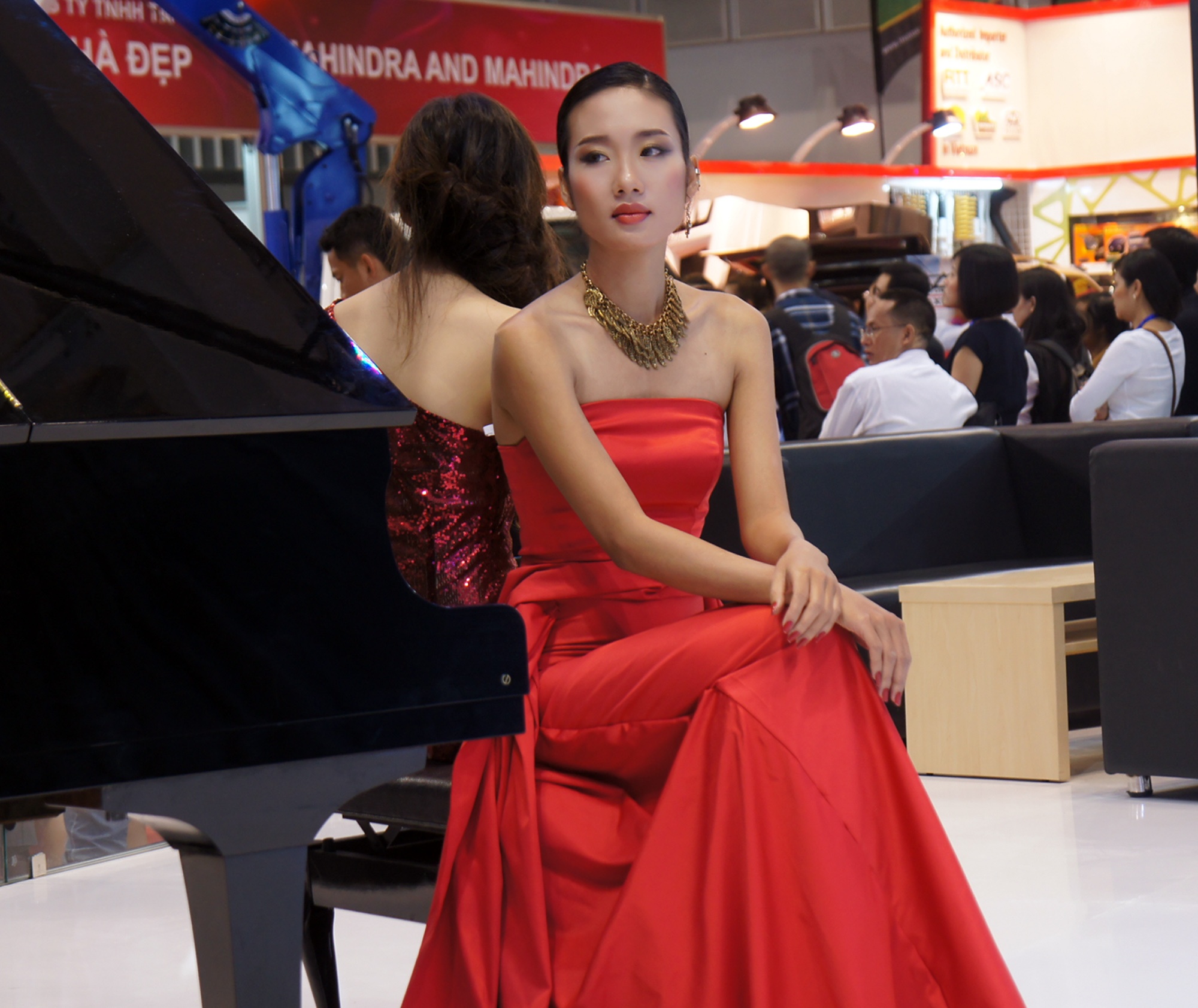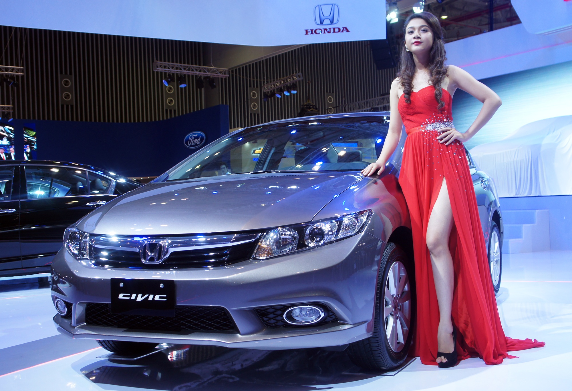 | Người mẫu ở gian hàng của Honda nổi bật trong bộ váy đỏ quyến rũ. |