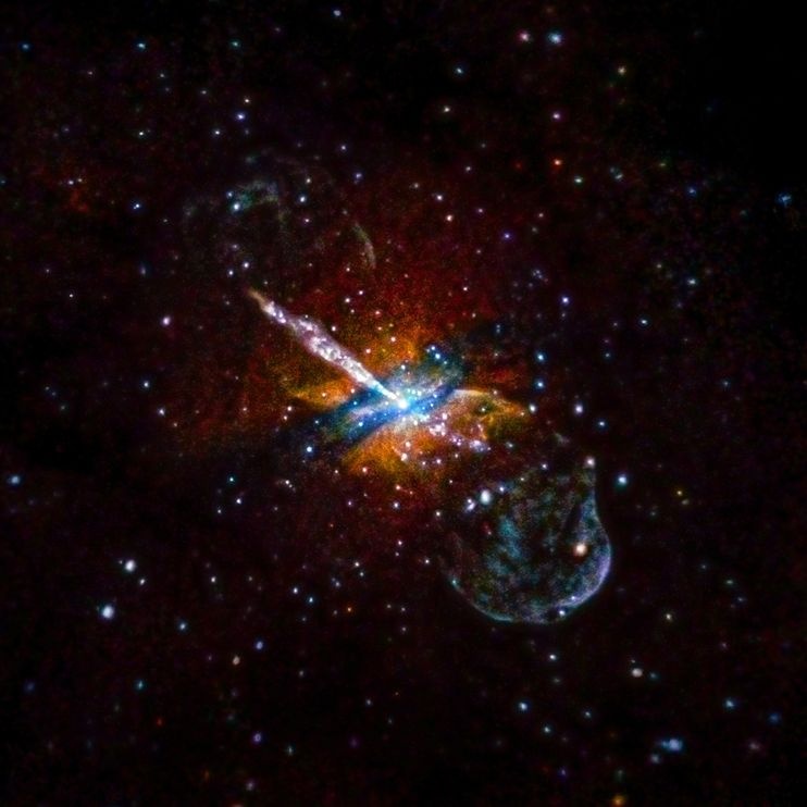 | Luồng vật chất phun ra từ hố đen ở trung tâm thiên hà Centaurus A, nơi cách trái đất 12 triệu năm ánh sáng. Hố đen khổng lồ đẩy khí, bụi mà nó từng hút của các ngôi sao tới gần nó. Ảnh: NASA |
