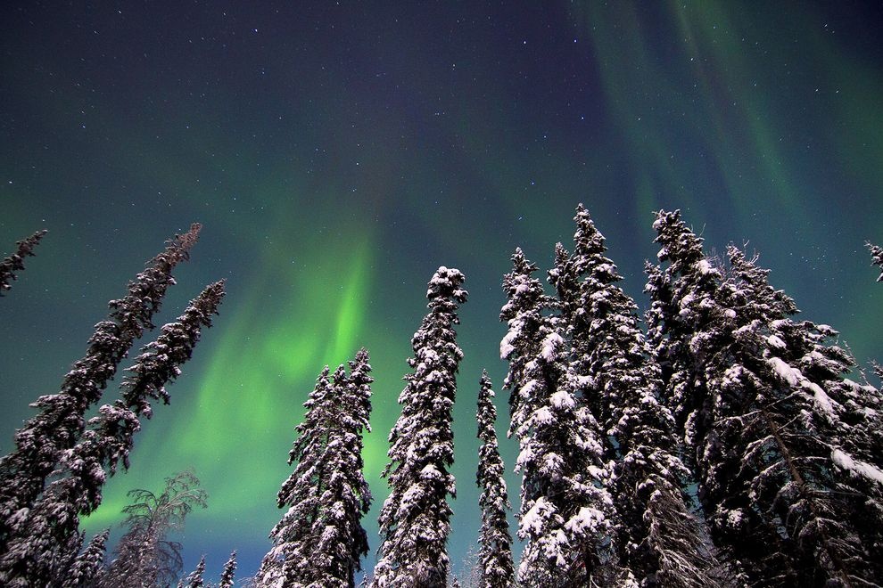 | Những dải cực quang màu xanh ở phía trên thành phố North Pole, bang Alaska, Mỹ. Ảnh: National Geographic |