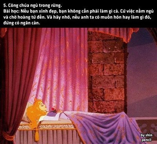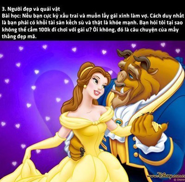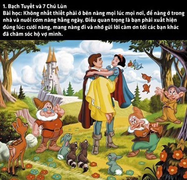 | Từ một câu chuyện, mỗi người, mỗi lứa tuổi, từng thời điểm... người ta lại nhìn nhận vấn đề theo một chiều hướng khác nhau. Với những bạn trẻ hiện đại, họ lại nhìn thấy bài học mà câu chuyện cổ tích nổi tiếng Bạch tuyết và bảy chú lùn muốn nhắn nhủ với những cặp đôi đang yêu hoặc đang tìm một nửa cho tình yêu là: Yêu lâu chưa chắc đã hay, biết chớp thời cơ mới là người thông minh. |