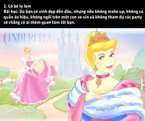 | Chi tiết chàng hoàng tử không nhận ra Lọ Lem cho đến khi nàng ướm vừa chiếc giày đánh rơi nói cho chúng ta biết rằng, nếu trút bỏ lớp son phấn, Lọ Lem sẽ mãi là Lọ Lem. |