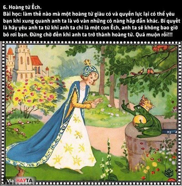 | Bài học mà hoàng tử ếch muốn gửi gắm dưới góc nhìn của người trẻ chính là: Đừng đợi một anh chàng trở nên giàu có và đẹp trai rồi mới tiến đến yêu họ vì khi ấy, bạn chỉ là một vô vàn những lựa chọn mà thôi. |