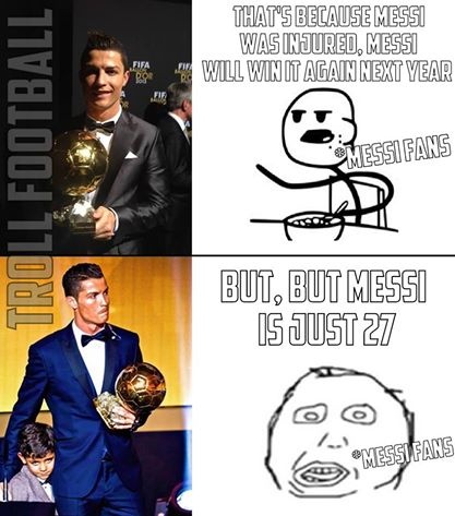 | Fan Messi lý giải về việc thần tượng của họ 2 lần lỡ danh hiệu QBV là "Nhưng Messi ấy mới chỉ 27" và "Đó là vì Messi chấn thương. Anh ấy sẽ trở lại vào năm sau". |