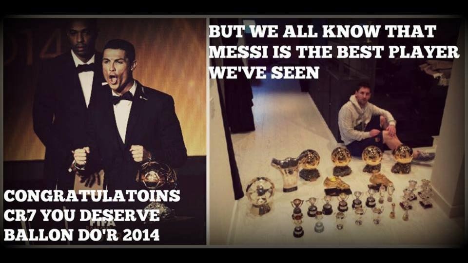| "Chúc mừng CR7, anh xứng đáng giành QBV 2014. Tuy nhiên, tất cả đều biết rằng Messi mới là cầu thủ xuất sắc nhất thế giới". |