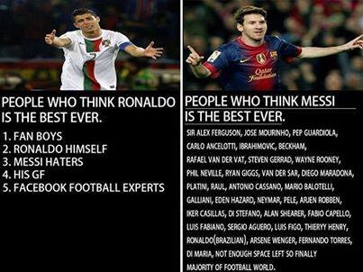 | Ronaldo là cầu thủ xuất sắc nhất trong mắt các fan của mình, bản thân CR7, những người ghét Messi... Trong khi Messi là người giỏi nhất trong mắt các chuyên gia và cầu thủ bóng đá, HLV hàng đầu thế giới. |