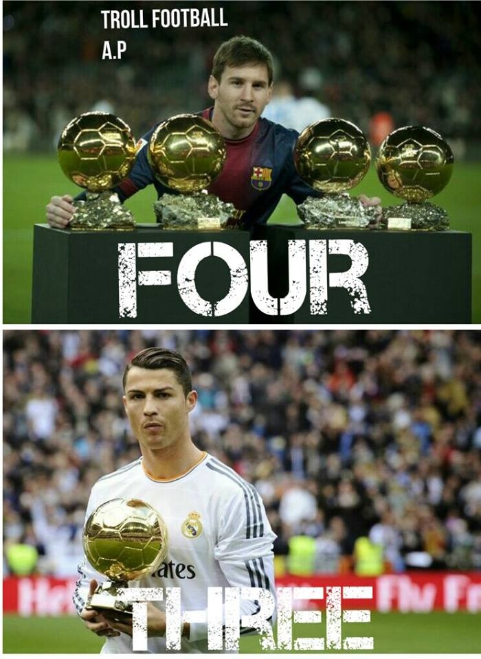 Sự khác biệt giữa Ronaldo và Messi là một Quả bóng vàng. CR7 mới 3 lần giơ cao danh hiệu này, trong khi M10 có 4 lần.
