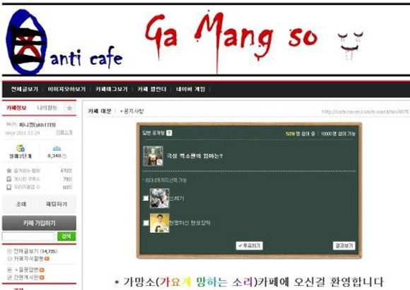 Theo thông tin độc quyền từ trang Sports World, trang này có tên gọi là Ga Mang So (viết tắt của cụm từ “gayogye manghaneun sori” nghĩa là âm thanh phá hủy Kpop). Cùng với số lượng thành viên tăng lên một cách nhanh chóng, trang này đã liên tục đăng tải những lời phỉ báng và bôi nhọ từng thành viên của EXO.